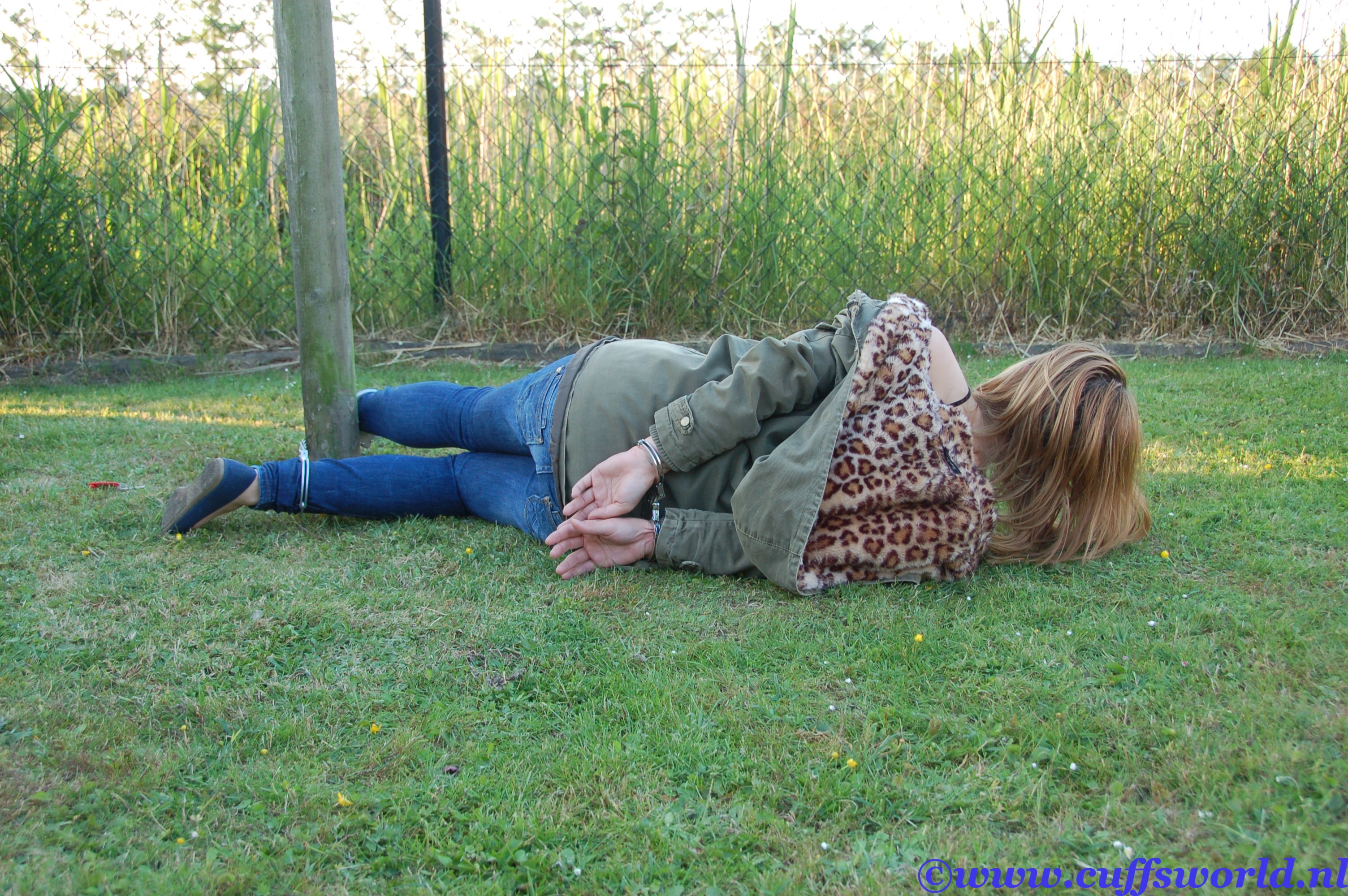 For this set we used the same pole as we used in the videoclip with Marija. Actually the pictures aer taken before Marija push the pole out of the ground, as you can see in the clip. She only change of coat. I look it was love at first sight when see sees the khaki collored coat in our wardrobe. We took a shiny set of hanged handcuffs and a set of AHC legirons to cuffed het on the pole.